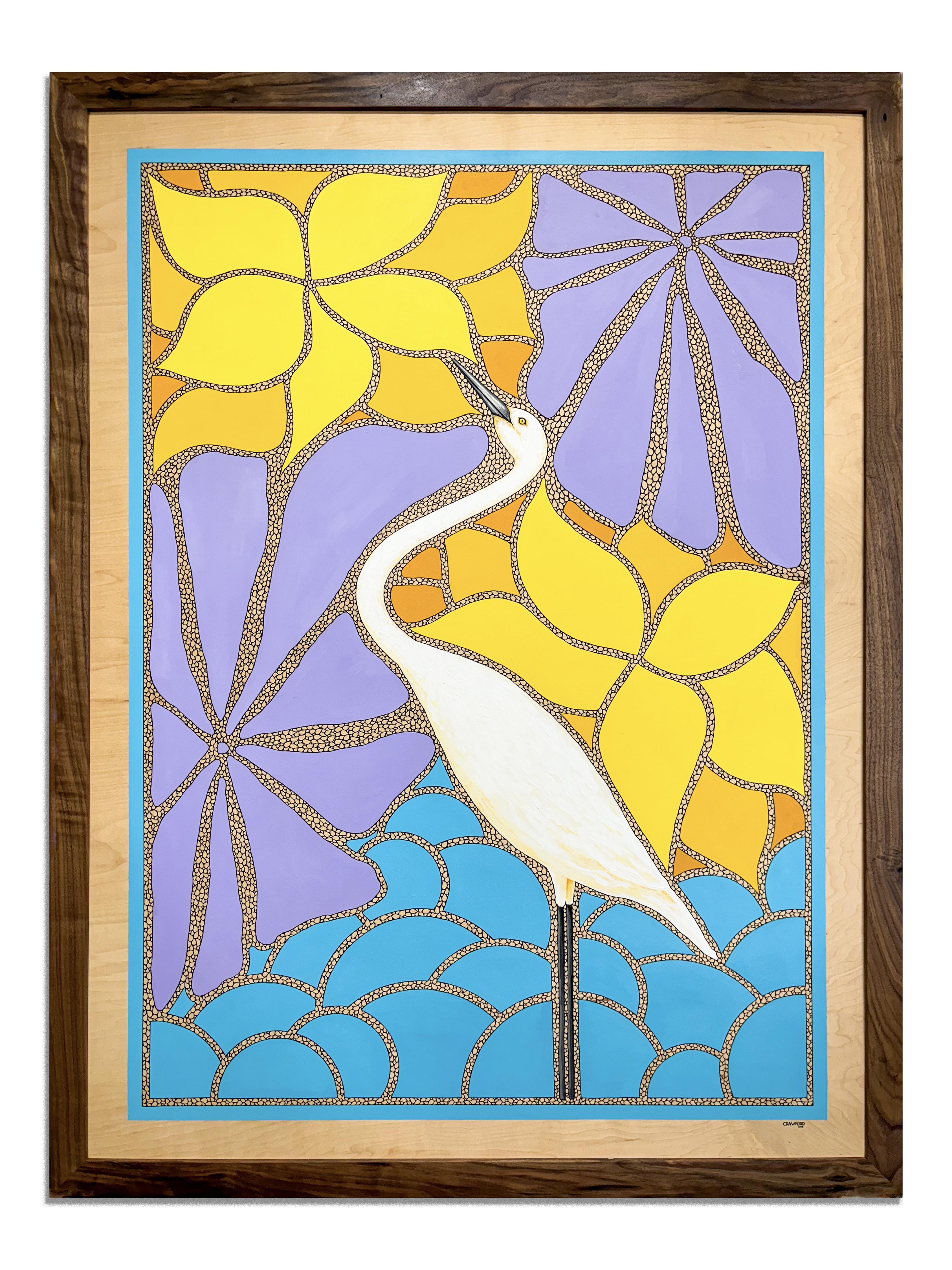 Inspired by the tranquil beauty of the California coast, Garza captures the elegance of a great egret set against a vibrant, dreamlike background. The bird stands poised and graceful amidst stylized waves, surrounded by blooming florals in warm yellow and soft lavender, evoking a sunset over the ocean. The color palette and flowing lines draw the viewer into the calm yet dynamic essence of coastal life.