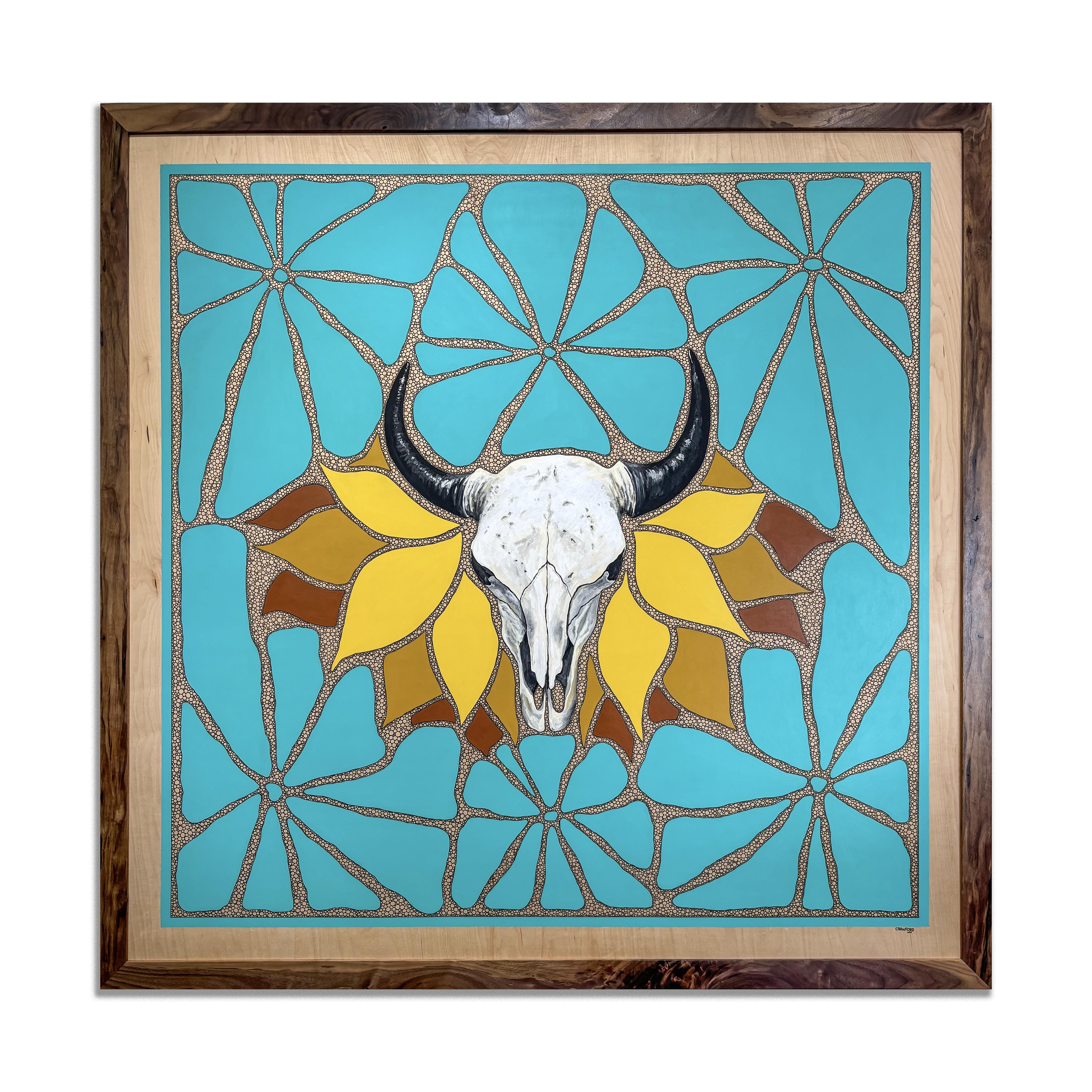 This captivating artwork brings together the essence of southwestern art with the laid-back vibe of California beach culture. At its center, a striking bull skull symbolizes both strength and fragility, standing as a reminder of the delicate balance between life and death. Surrounding the skull are vivid turquoise and golden hues, invoking a sense of tranquility and energy—a representation of the ocean’s calmness and the desert’s warmth.