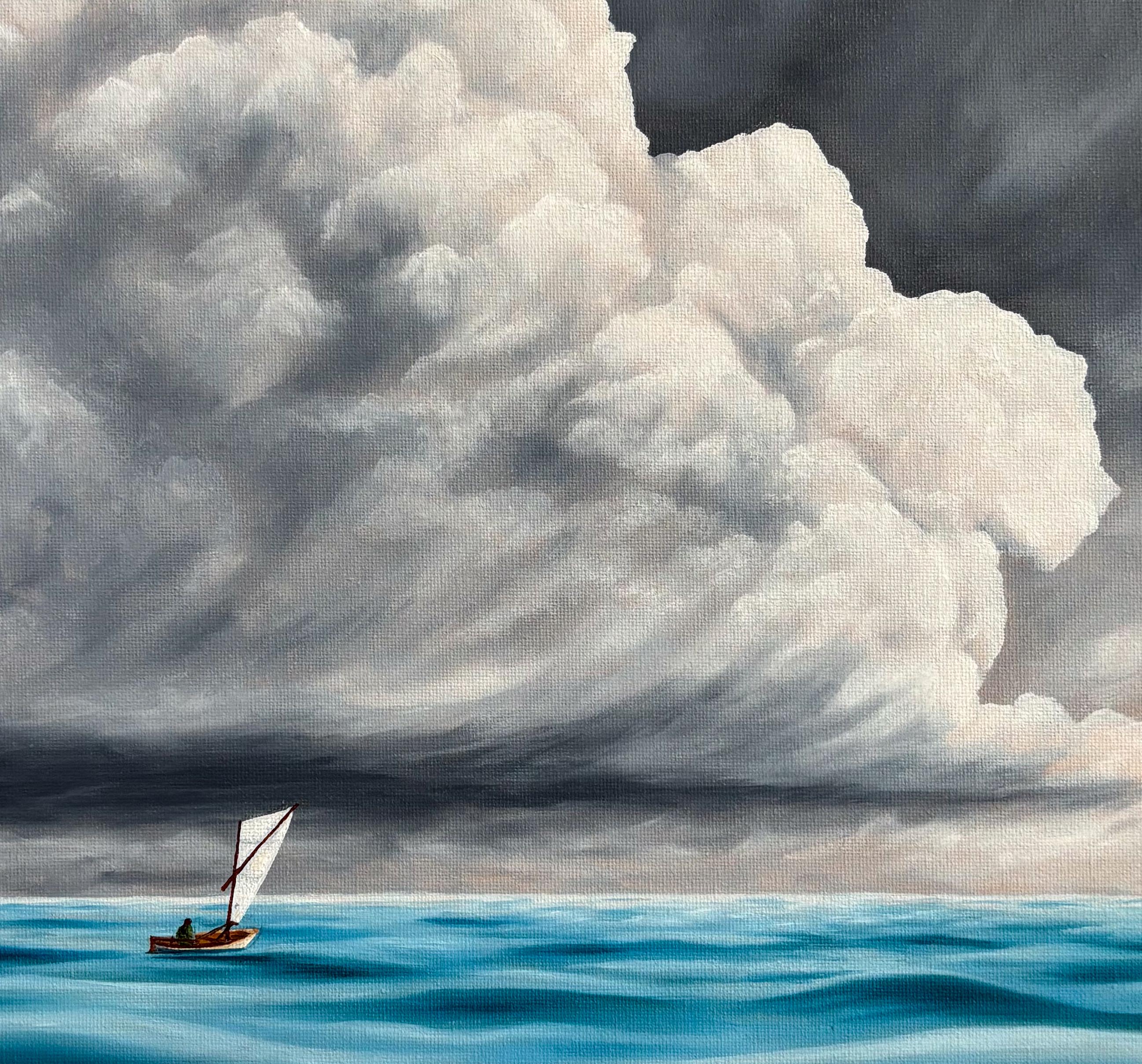 A vast expanse of sea and sky, quiet and unbroken. For a time, I considered leaving it empty—letting the water stretch into silence without interruption. But something in the horizon called for more, and a lone boat emerged, set against the weight of the storm.