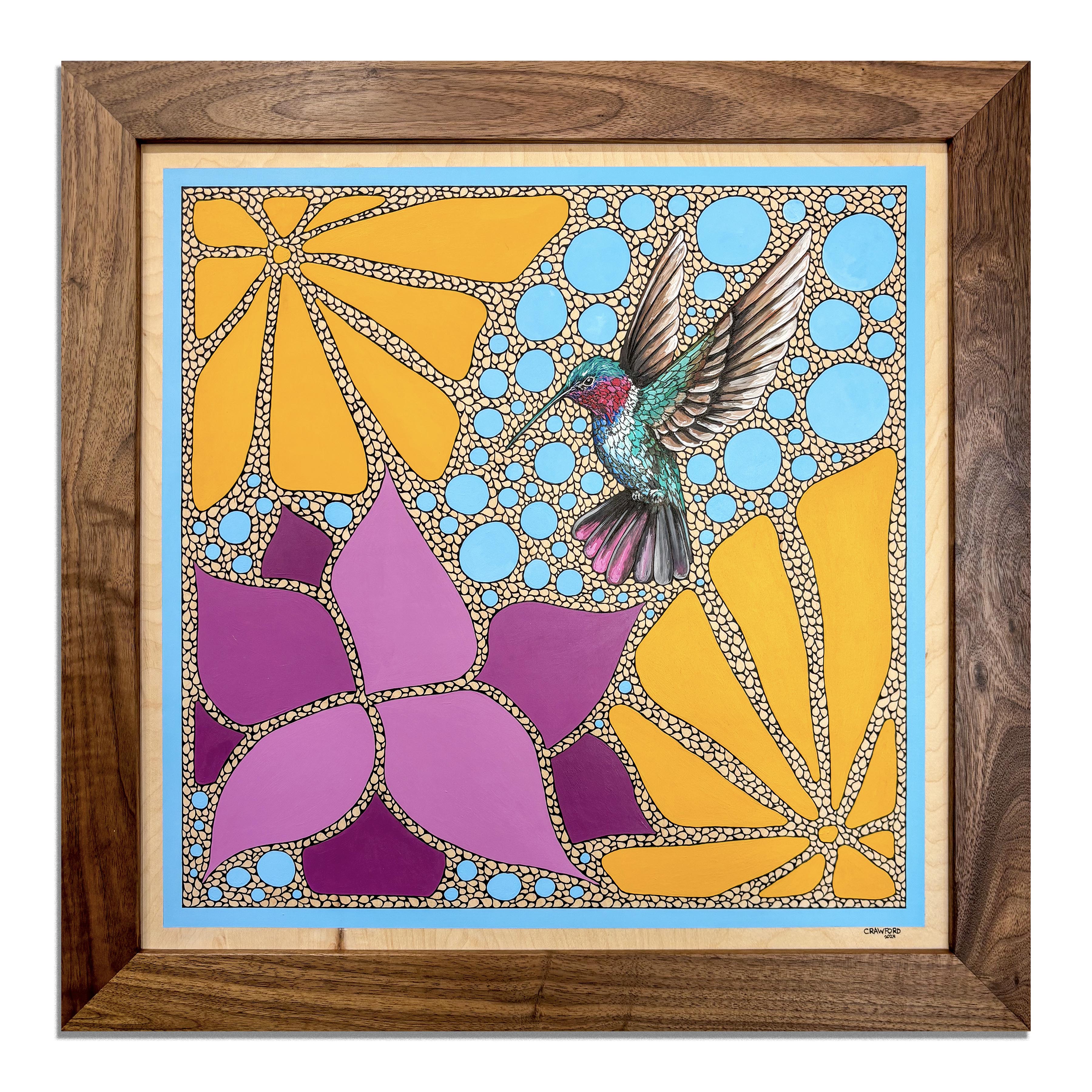 Perfect Navigation captures the grace and precision of a hummingbird in flight, set against a vibrant, abstract background of blooming florals. Inspired by the hummingbird’s incredible ability to navigate and hover with ease, this piece brings together bright colors and intricate patterns to celebrate nature’s elegance and beauty.